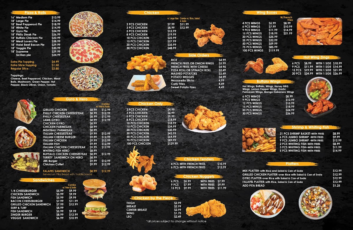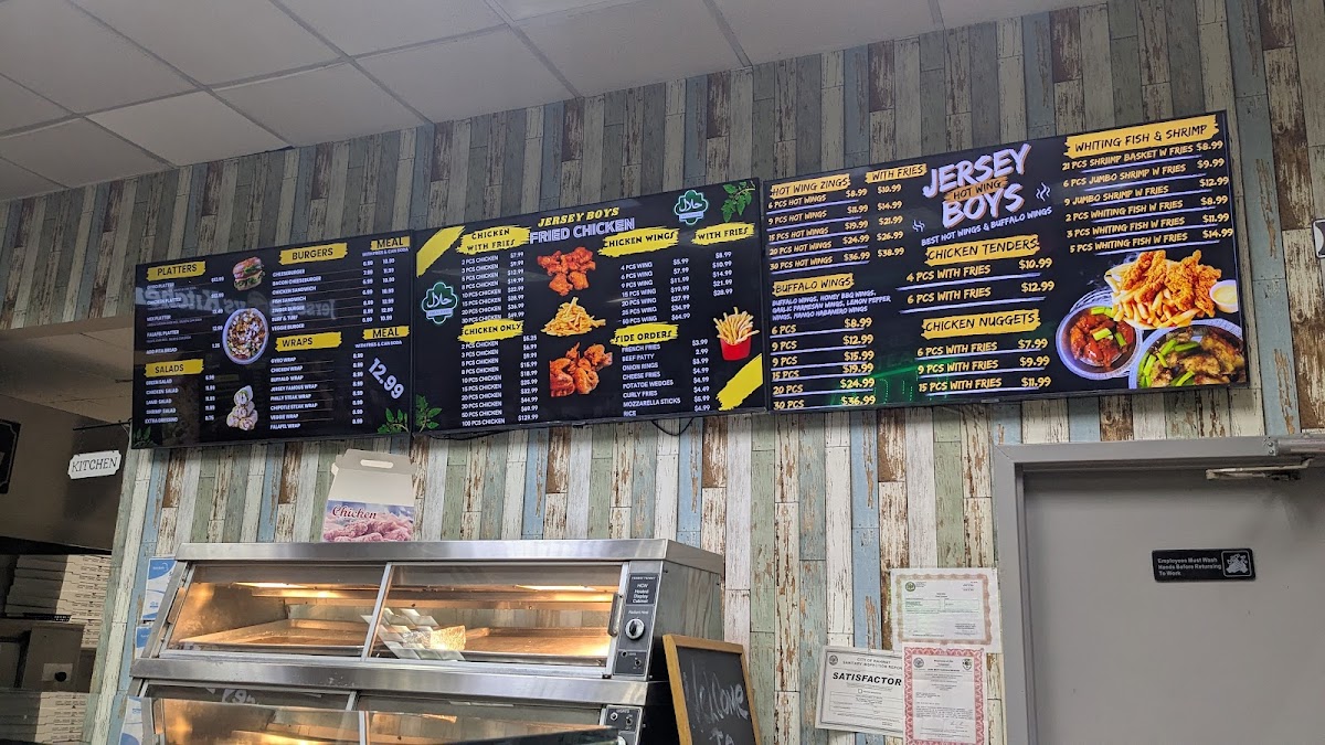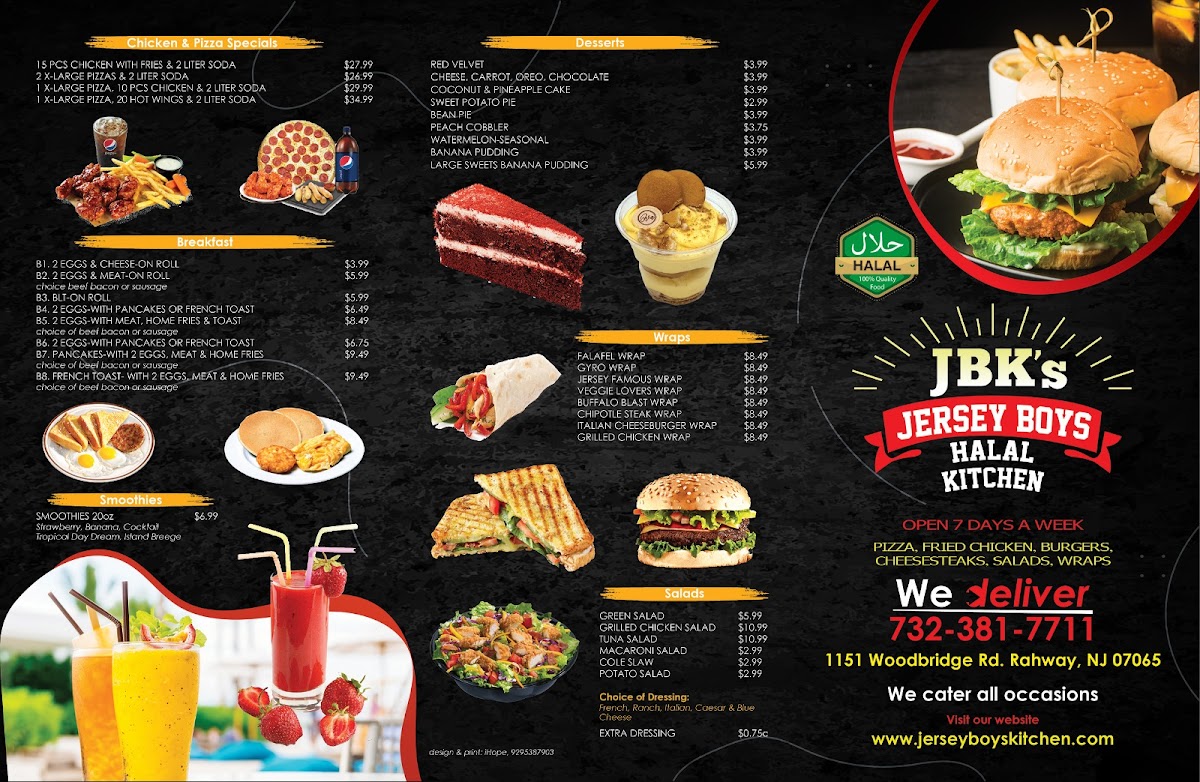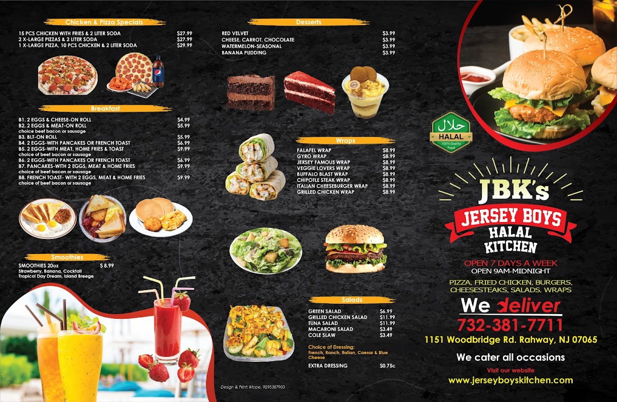 The menu at Jersey Boys Kitchen (Halal) offers a wide variety of flavorful options, catering to all tastes. For breakfast, you can enjoy hearty dishes like Pancakes with 2 Eggs, Meat & Hash Browns ($8.99) or French Toast with the same sides ($8.99), or simpler choices such as 2 Eggs & Cheese on Roll ($4.50) and BLT on Roll ($5.50). The salad section features light options like Macaroni Salad ($3.00) and more filling choices like the Grilled Chicken Salad ($8.99) or Gyro Salad ($7.50). If you're in the mood for a sandwich, you can pick from classics such as the Cheeseburger ($5.99) or the Chicken Sandwich ($6.99), and for a more substantial meal, try a Philly Cheesesteak Hero ($8.99) or Buffalo Chicken Cheesesteak Hero ($8.99). The wraps are just as tempting, with favorites like the Jersey Famous Wrap ($8.99) or Falafel Wrap ($7.99). Pizza lovers will enjoy the 18" Beef Pepperoni Pie ($16.99) and the 18" Gyro Pie ($16.99), while the chicken options range from simple Chicken with Fries ($7.99) to flavorful Hot Wing Zings with 1 Side ($8.99). For seafood, the 21 Piece Shrimp Basket with Fries ($12.99) and Whiting Fish with Fries ($9.99) are standout choices. Platters such as the Mix Platter ($13.99) and Gyro Platter ($12.99) provide hearty portions. On the side, enjoy Mozzarella Sticks ($5.99) or Curly Fries ($3.99), and don’t forget to finish off your meal with a slice of Red Velvet Cake ($3.99) or a refreshing Strawberry Banana Smoothie ($4.99). With something for every palate, Jersey Boys Kitchen offers a satisfying and diverse dining experience.