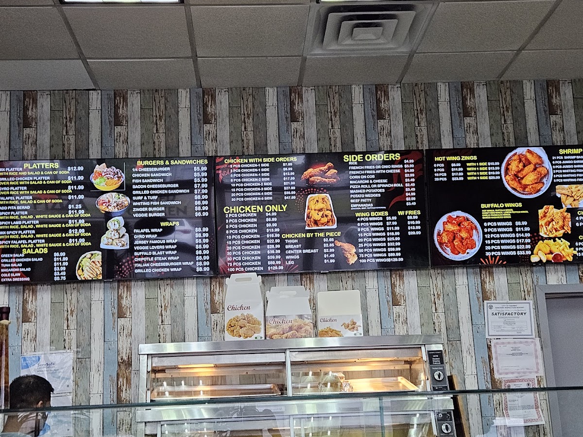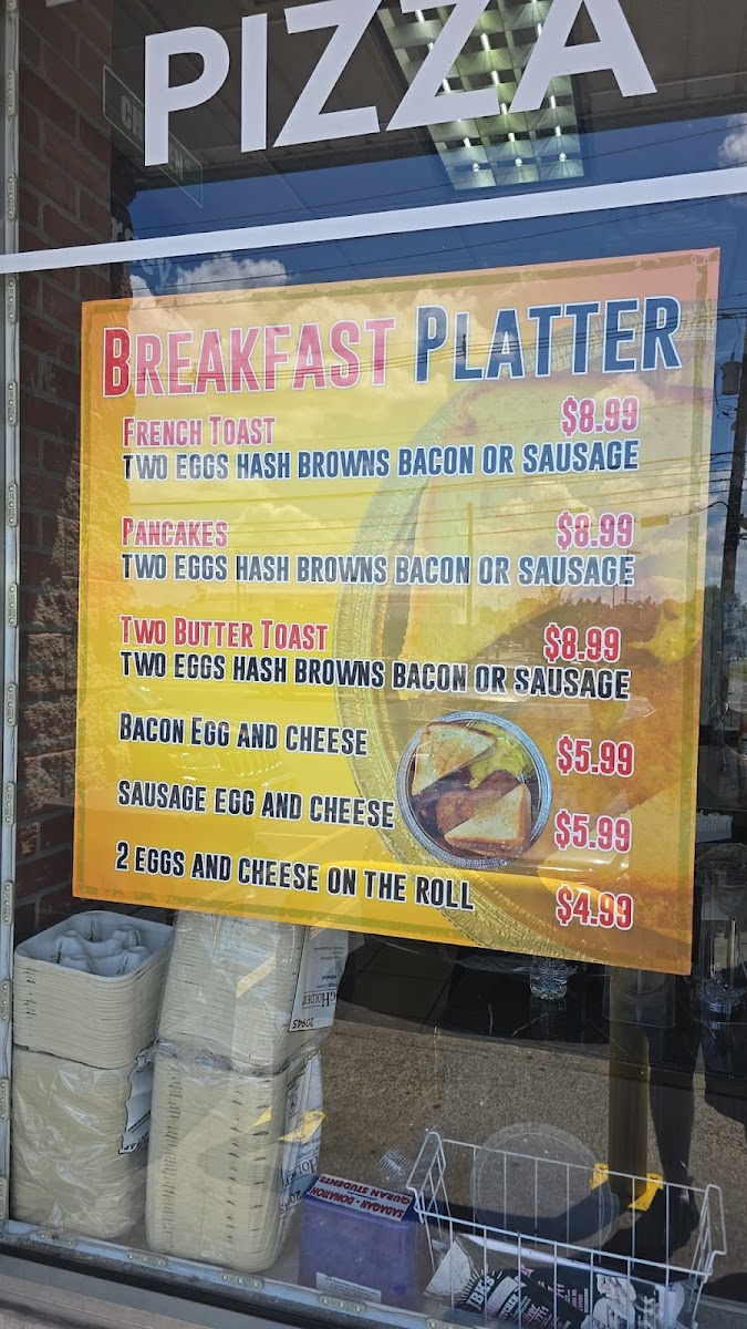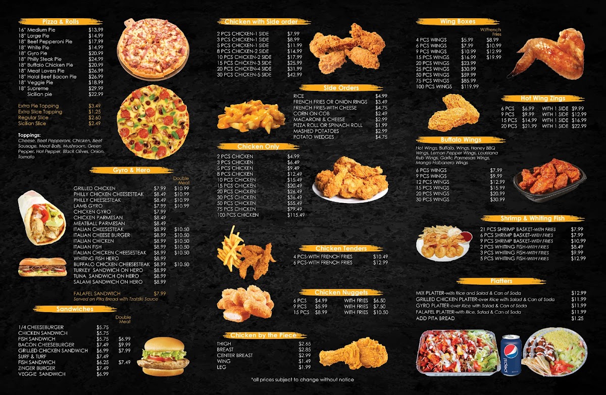 The menu at Jersey Boys Kitchen (Halal) offers a wide variety of flavorful options, catering to all tastes. For breakfast, you can enjoy hearty dishes like Pancakes with 2 Eggs, Meat & Hash Browns ($8.99) or French Toast with the same sides ($8.99), or simpler choices such as 2 Eggs & Cheese on Roll ($4.50) and BLT on Roll ($5.50). The salad section features light options like Macaroni Salad ($3.00) and more filling choices like the Grilled Chicken Salad ($8.99) or Gyro Salad ($7.50). If you're in the mood for a sandwich, you can pick from classics such as the Cheeseburger ($5.99) or the Chicken Sandwich ($6.99), and for a more substantial meal, try a Philly Cheesesteak Hero ($8.99) or Buffalo Chicken Cheesesteak Hero ($8.99). The wraps are just as tempting, with favorites like the Jersey Famous Wrap ($8.99) or Falafel Wrap ($7.99). Pizza lovers will enjoy the 18" Beef Pepperoni Pie ($16.99) and the 18" Gyro Pie ($16.99), while the chicken options range from simple Chicken with Fries ($7.99) to flavorful Hot Wing Zings with 1 Side ($8.99). For seafood, the 21 Piece Shrimp Basket with Fries ($12.99) and Whiting Fish with Fries ($9.99) are standout choices. Platters such as the Mix Platter ($13.99) and Gyro Platter ($12.99) provide hearty portions. On the side, enjoy Mozzarella Sticks ($5.99) or Curly Fries ($3.99), and don’t forget to finish off your meal with a slice of Red Velvet Cake ($3.99) or a refreshing Strawberry Banana Smoothie ($4.99). With something for every palate, Jersey Boys Kitchen offers a satisfying and diverse dining experience.